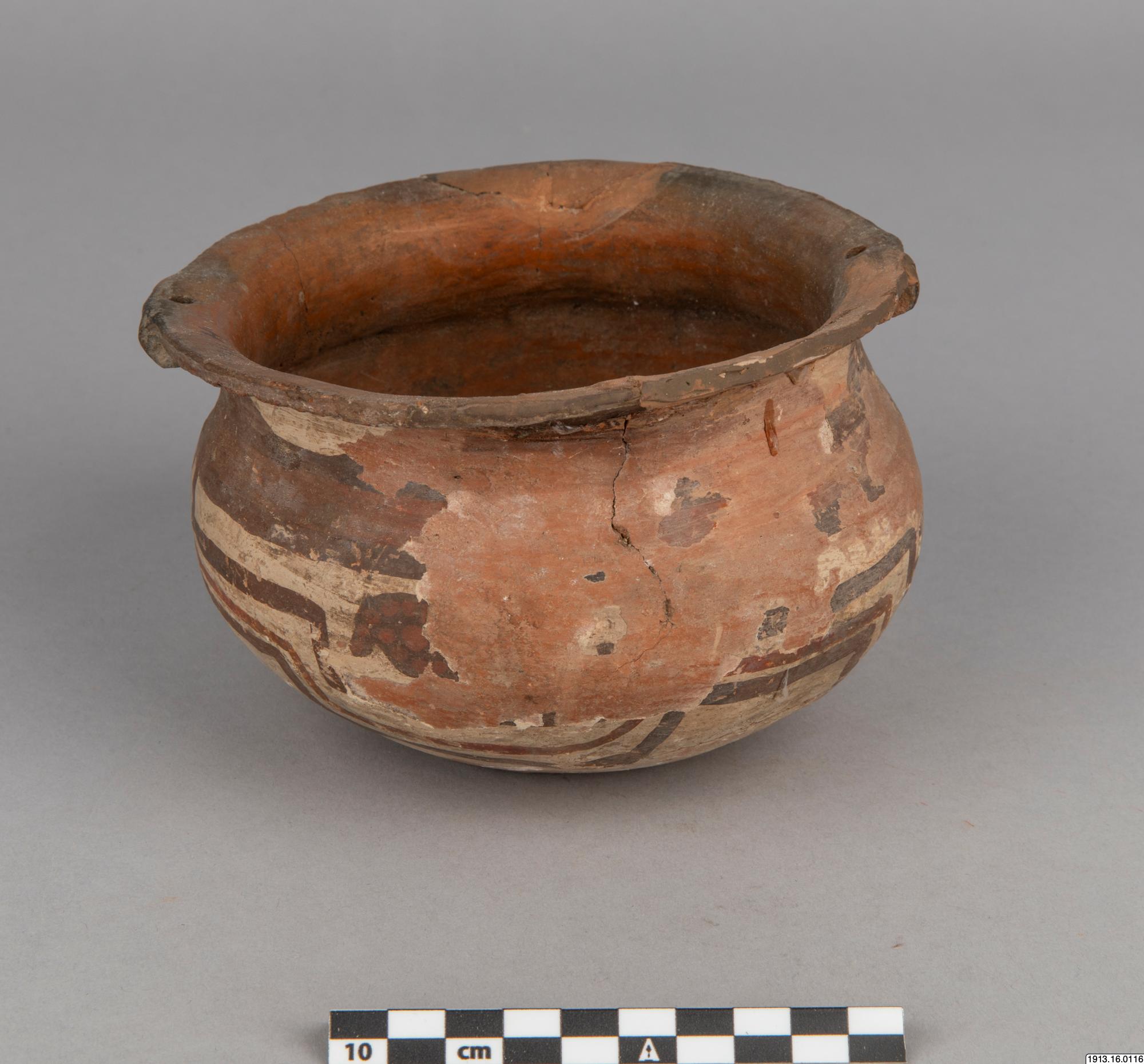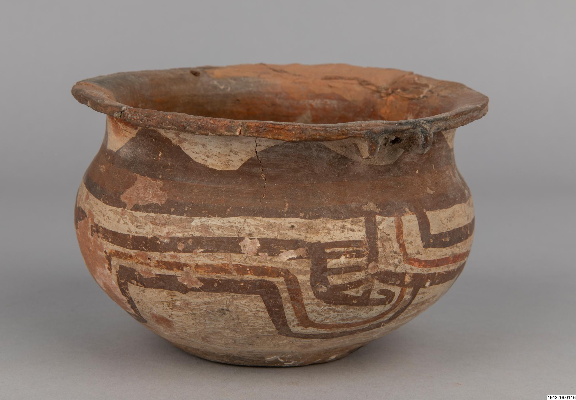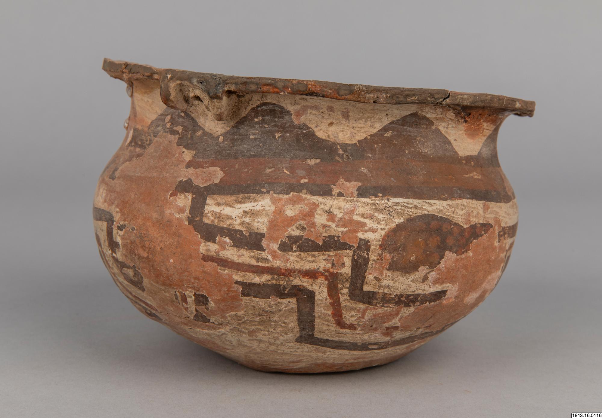 Generalkatalog sidan 75: Lerkärl. Av brunt gods. Bukig form med plan bottenyta och utsvängd mynningskant. På ömse sidor nedanför denna en dubbel knapp och på samma ställe en genomborrning som gör det möjligt hänga upp kärlet. Rester av ett täckande vitt färglager på yttersidan med målning i två bruna nyanser. Mynningskanten skadad. Höjd 10 cm. Max.diam. och mynningsdiam. 15 cm. Avbildad av Nordenskiöld 1920, fig. 42:18