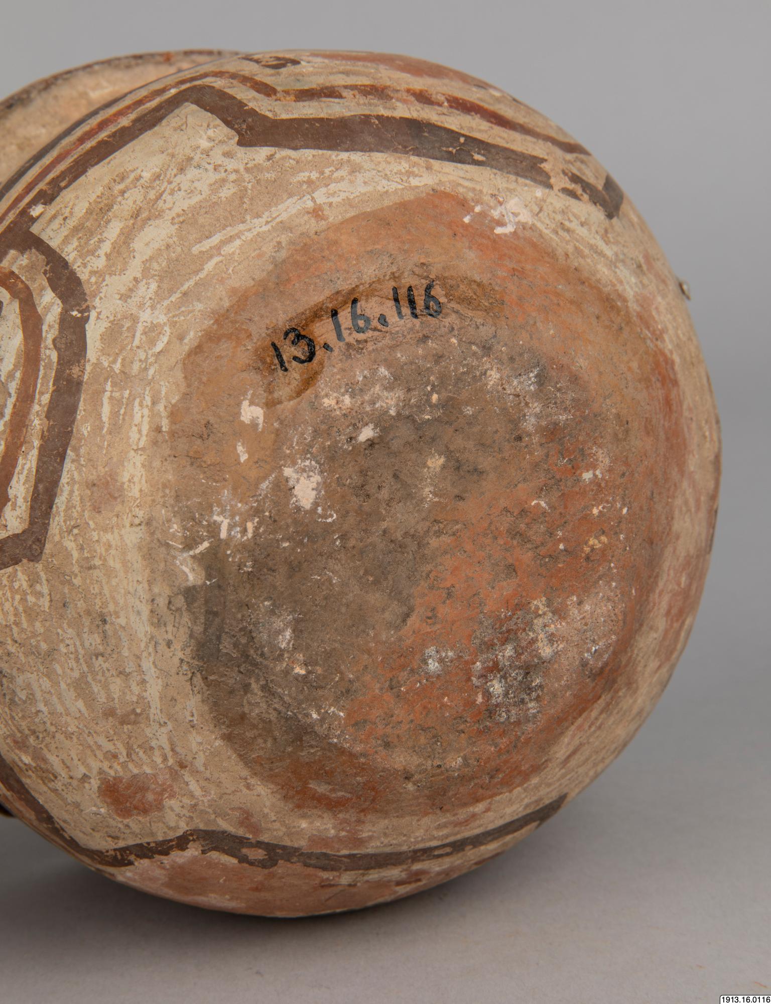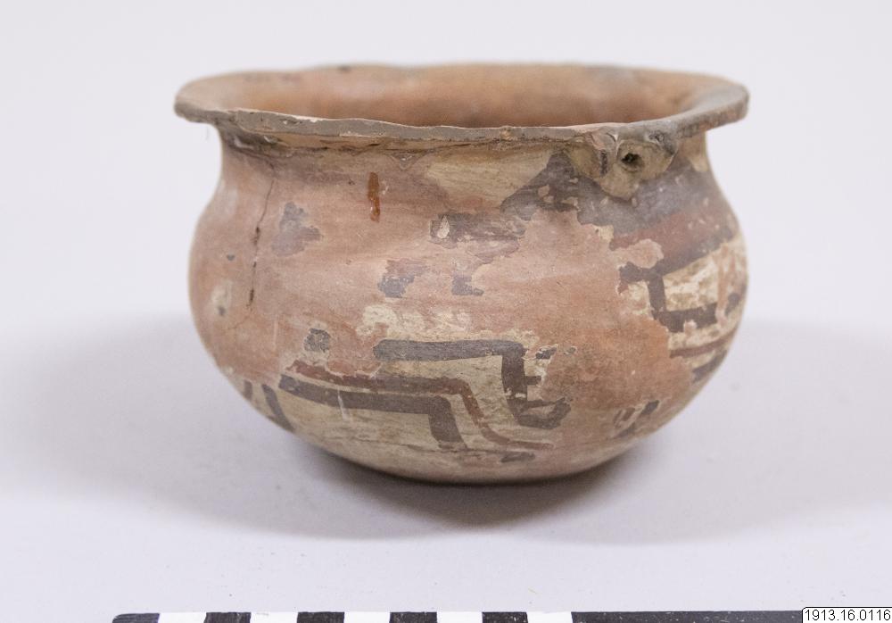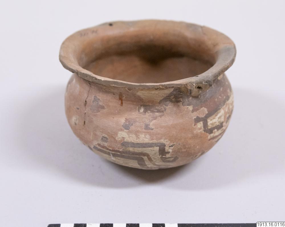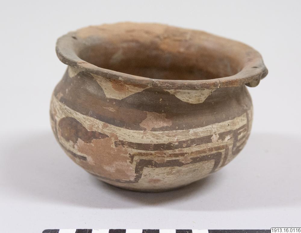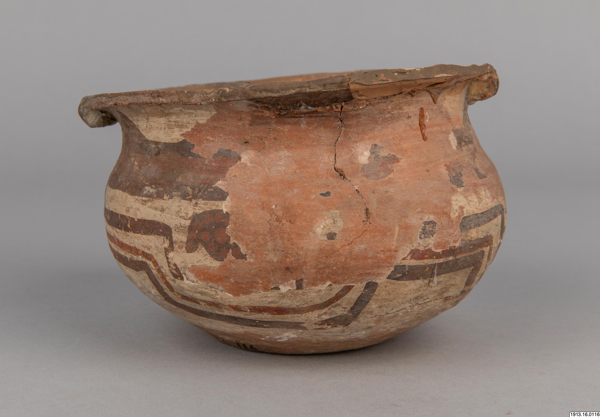 Generalkatalog sidan 75: Lerkärl. Av brunt gods. Bukig form med plan bottenyta och utsvängd mynningskant. På ömse sidor nedanför denna en dubbel knapp och på samma ställe en genomborrning som gör det möjligt hänga upp kärlet. Rester av ett täckande vitt färglager på yttersidan med målning i två bruna nyanser. Mynningskanten skadad. Höjd 10 cm. Max.diam. och mynningsdiam. 15 cm. Avbildad av Nordenskiöld 1920, fig. 42:18