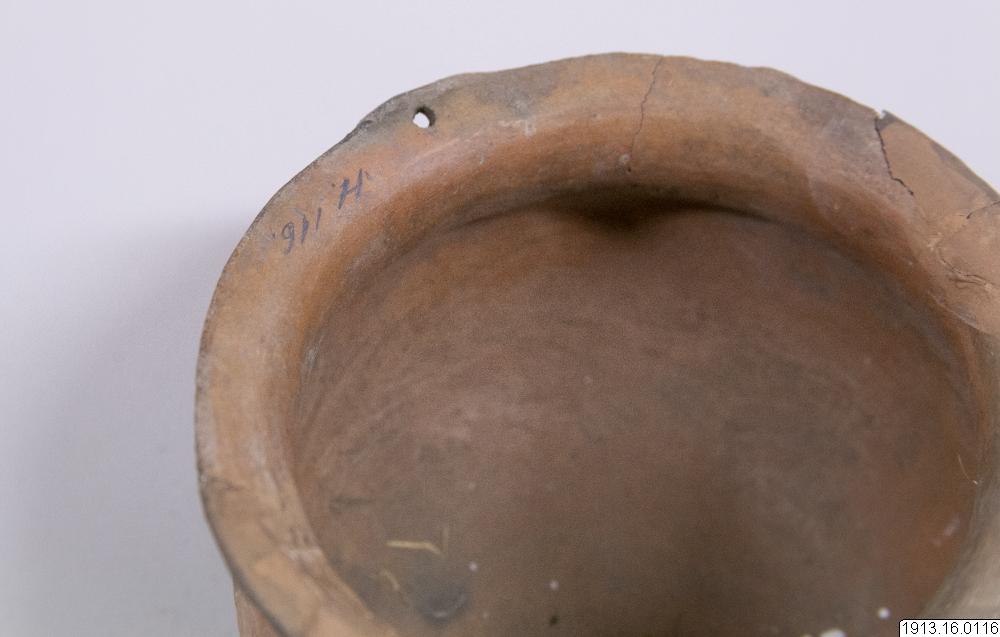Generalkatalog sidan 75: Lerkärl. Av brunt gods. Bukig form med plan bottenyta och utsvängd mynningskant. På ömse sidor nedanför denna en dubbel knapp och på samma ställe en genomborrning som gör det möjligt hänga upp kärlet. Rester av ett täckande vitt färglager på yttersidan med målning i två bruna nyanser. Mynningskanten skadad. Höjd 10 cm. Max.diam. och mynningsdiam. 15 cm. Avbildad av Nordens...