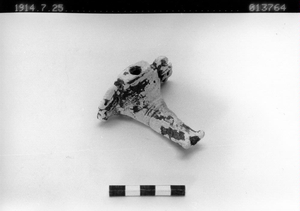 Krokodilhuvud ? kalkat. Långt utdragen, trynliknande nos. Ett hål går lodrätt igenom. Baksidan icke avslagen, varför det aldrig hört till något kärl. Längd: 7cm. Bredd: 6,5cm. Santa Marta Columbia Central-Amerika. (generalkatalogen)