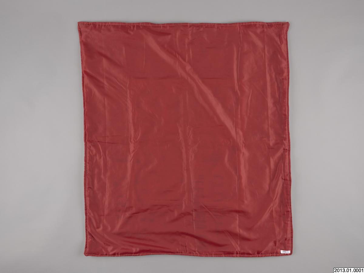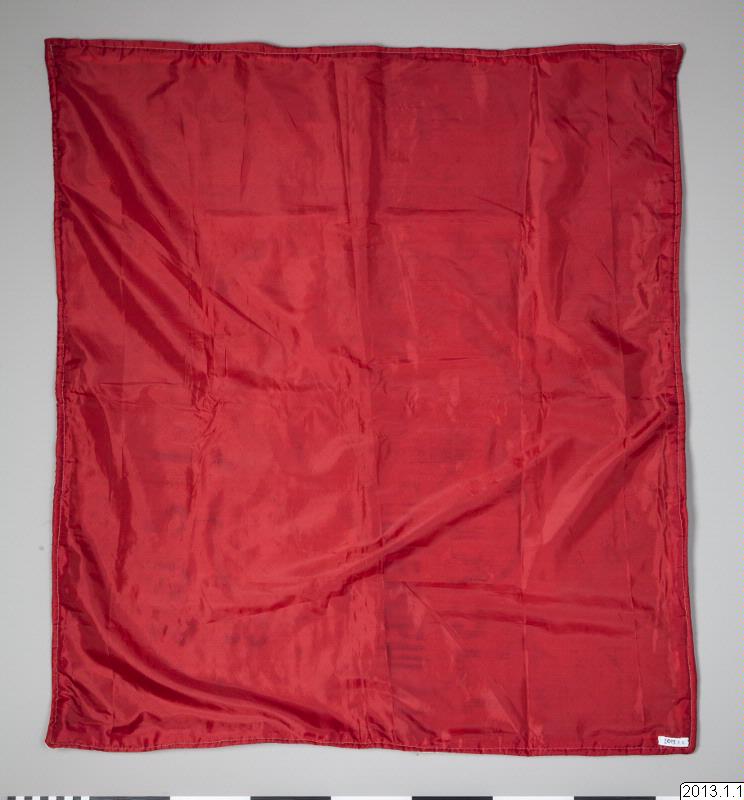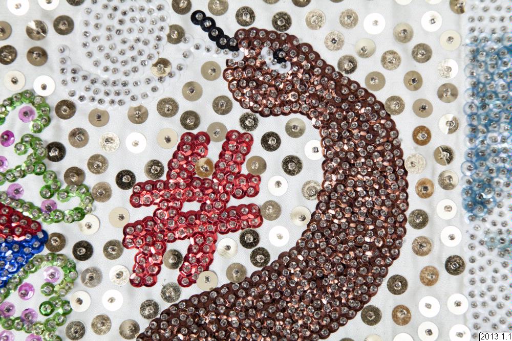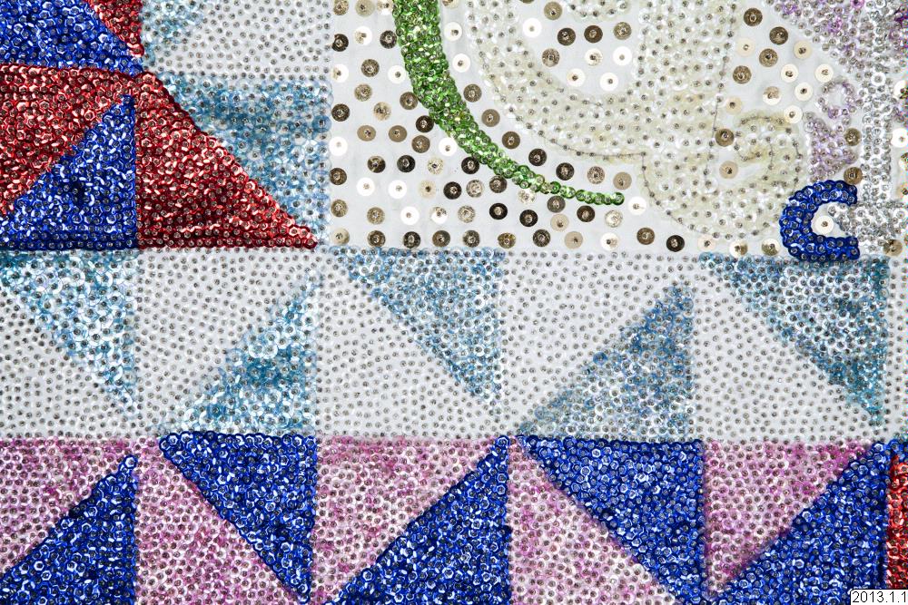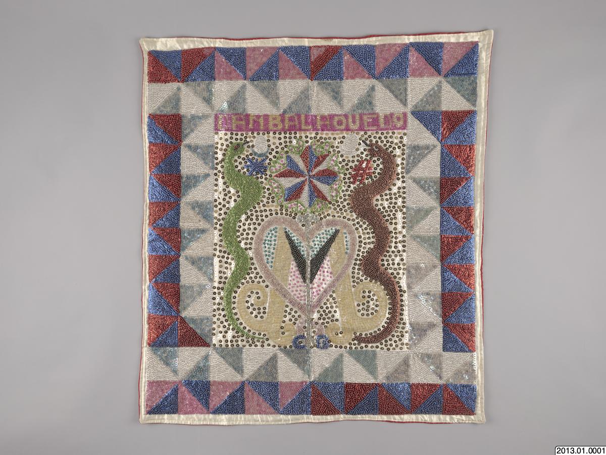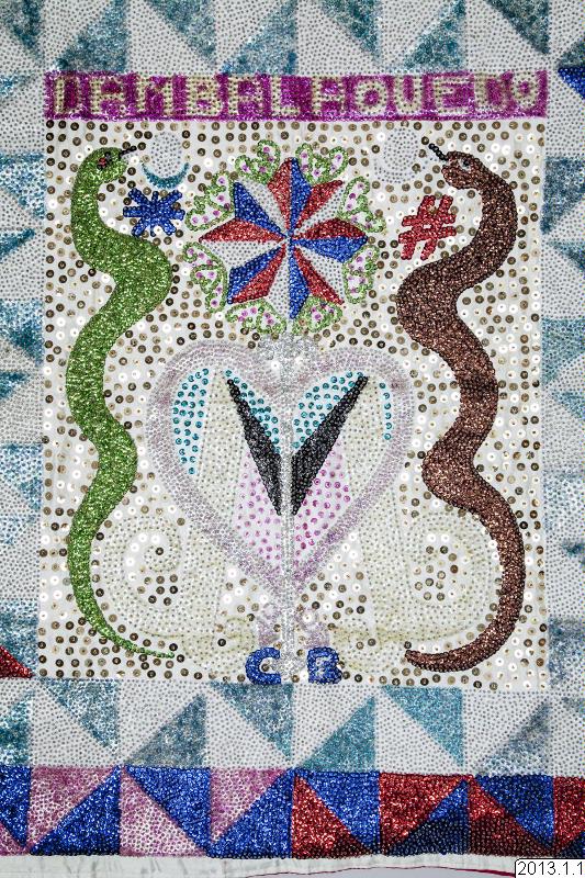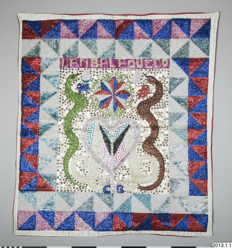 Ceremoniflagga-Drapó från Haiti. Paljett och pärlbeklädd i olika färger. I mitten avbildas två ormar på vardera sidan om ett hjärta, ovanför står texten DAMBALAQUEDO. Runt mittbilden löper två rader med diagonalt skurna fyrkanter. Baksidan är fodrad med rosa sidentyg.