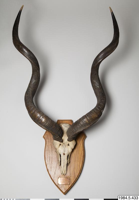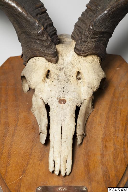 • Kranium och horn från okänt djur, monterad på en väggplatta av trä.