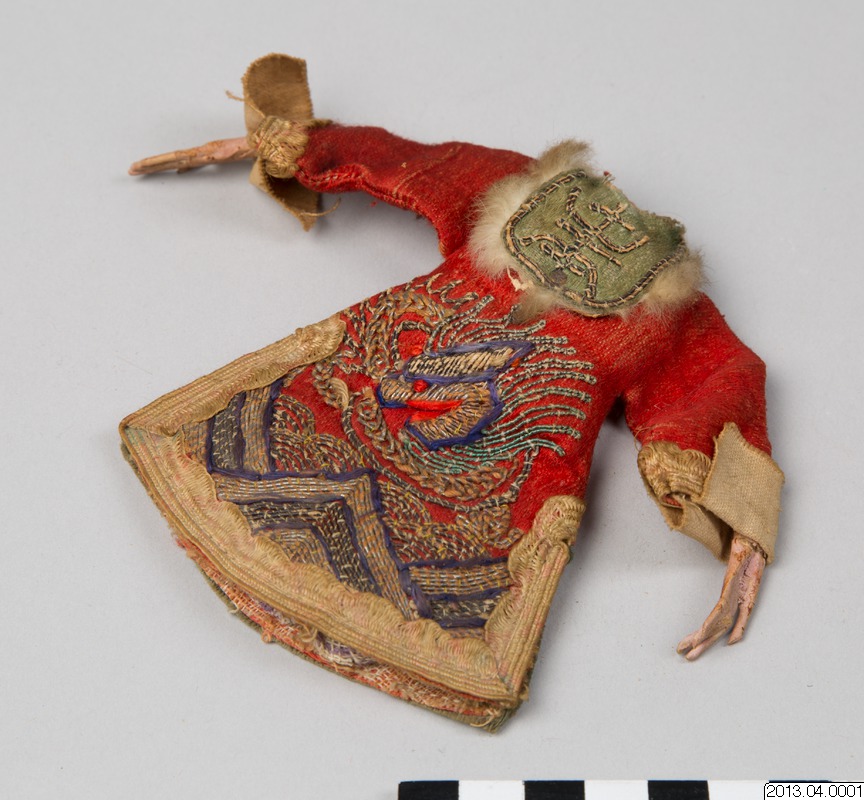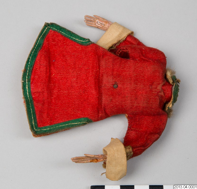 Liten docka i röd, grön och ofärgad textildräkt. Dräktens ben är lila och vita. Omfattande broderad dekor och bröstparti utsmyckad med päls. Dockan saknar huvud och ben, men har armar och händer. Händerna är i pressat och bemålat papper.