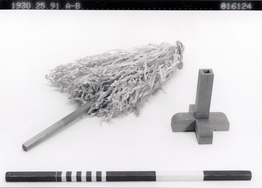 Del av uppsättning till altare. Ursprungligen var det under inventarienumret 1930.25.0061 ett enda nummer för en mängd föremål som hörde till altaruppstasen. Detta nummer ändrades 1995-96 till många olika, separerade nummer eftersom det handlade om så många föremål. Ida Trotzig skänkte också ett manuskript, 1930.25.0063, som handlar om denna shinto-sekt.