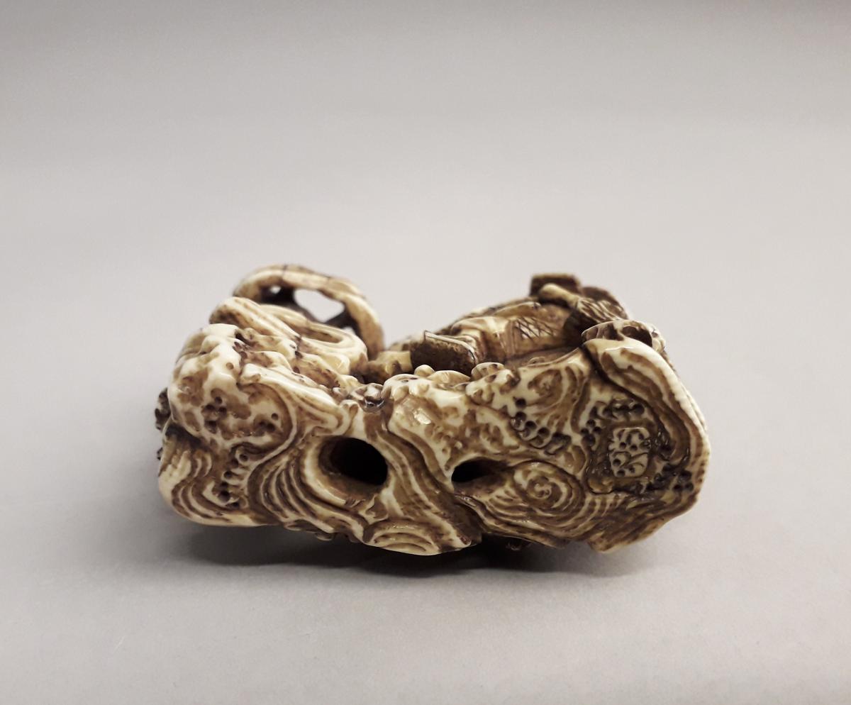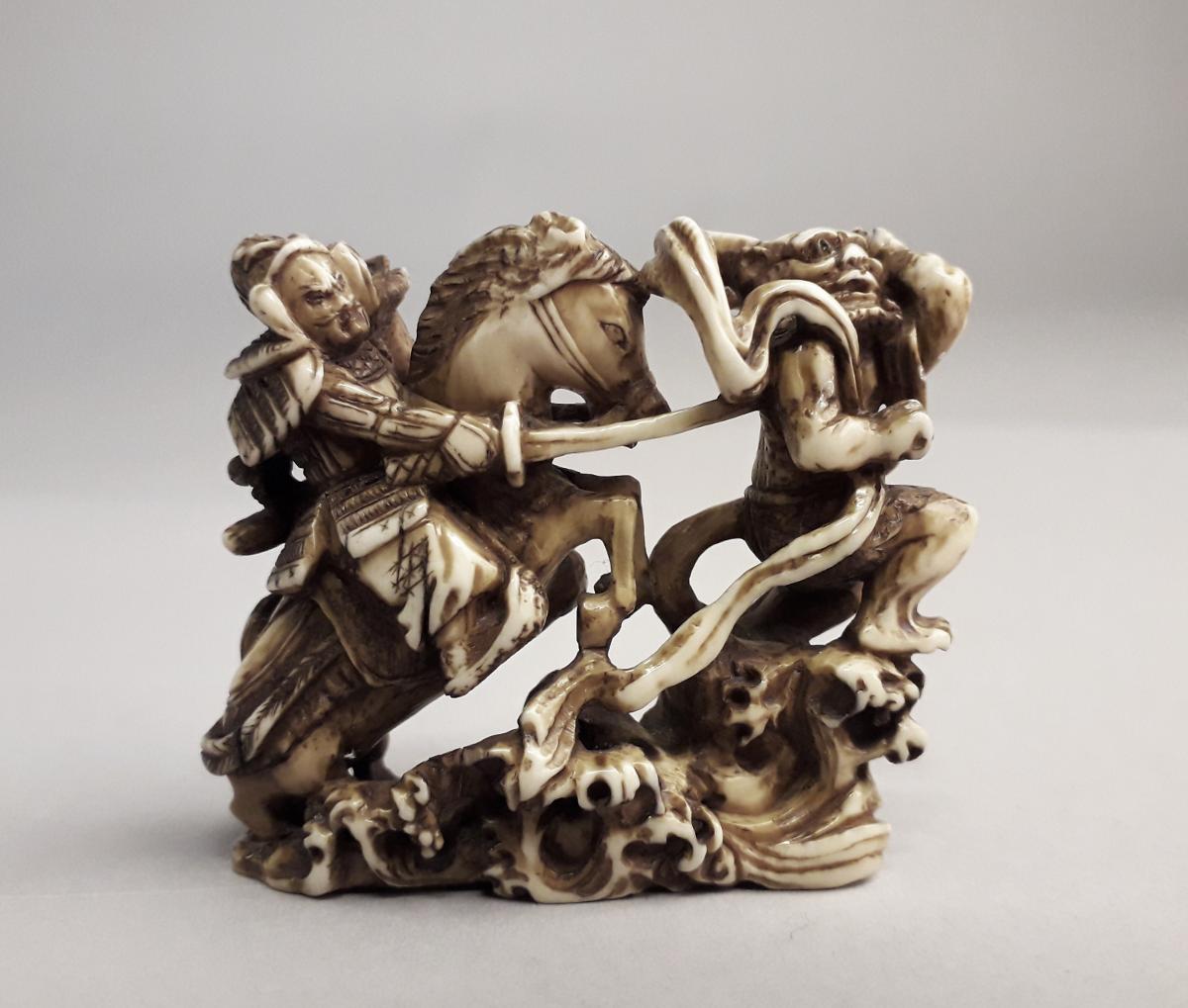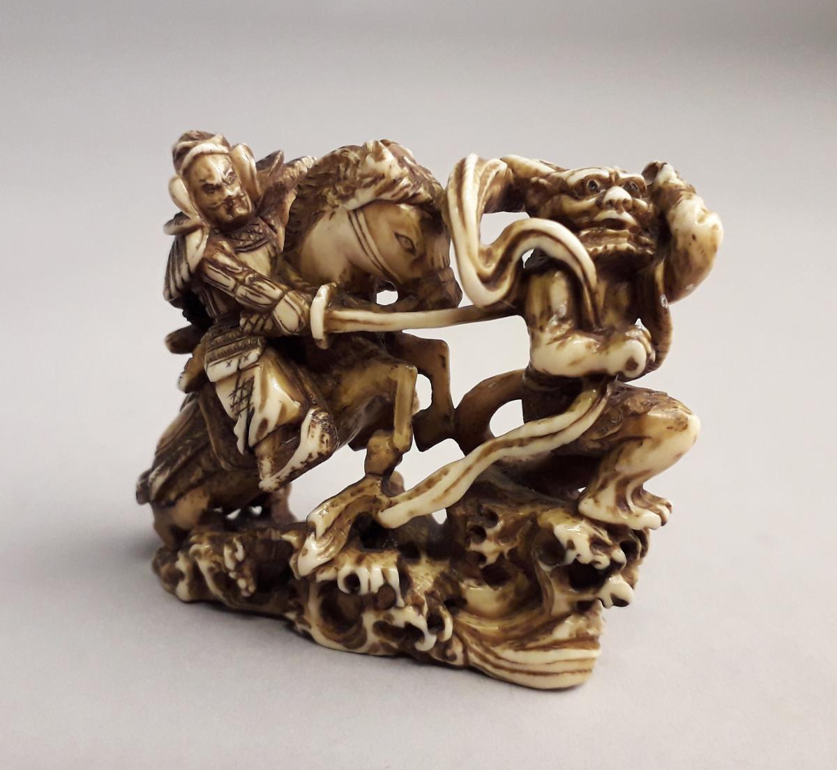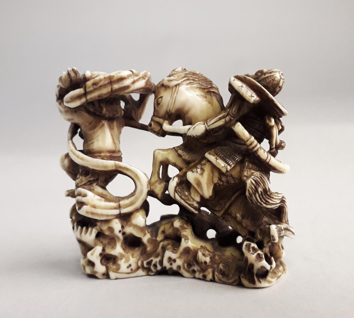 • Netsuke of ivory in the shape of Shoki catching a demon (oni). 5.3 x 2.3 cm.