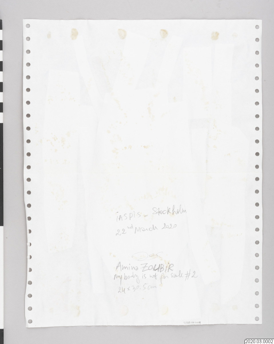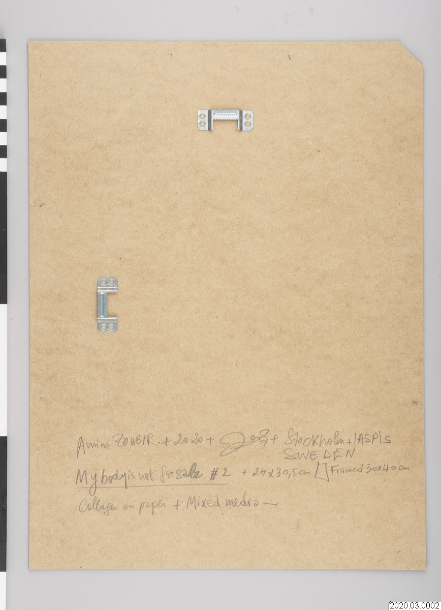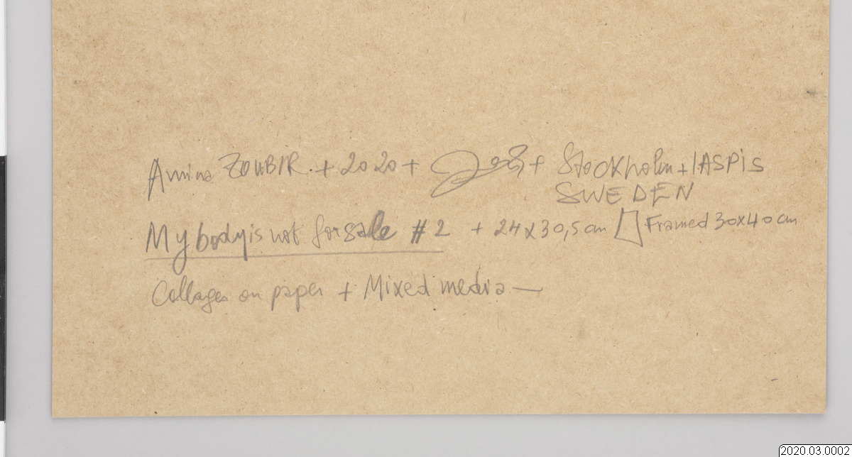 Verket skapat under perionen våren/sommaren 2020 då Amina Zoubir varit på ett residens vid IASPIS och ett vid Nordiska Konstnärsförbundet då hon fokuserade sin praktik på etnografiska bilder av kvinnor från Nordafrika, bland annat i Världskulturmuseernas samlingar. Hon besökte både bildarkiv och bibliotek på EM och VKM. I serien med namnet My Body is not for Sale utforskar AZ sambanden mellan etnografiskt fotografi, misogyni, orientalism, erotik och nutida blickar på den kvinnliga kroppen.