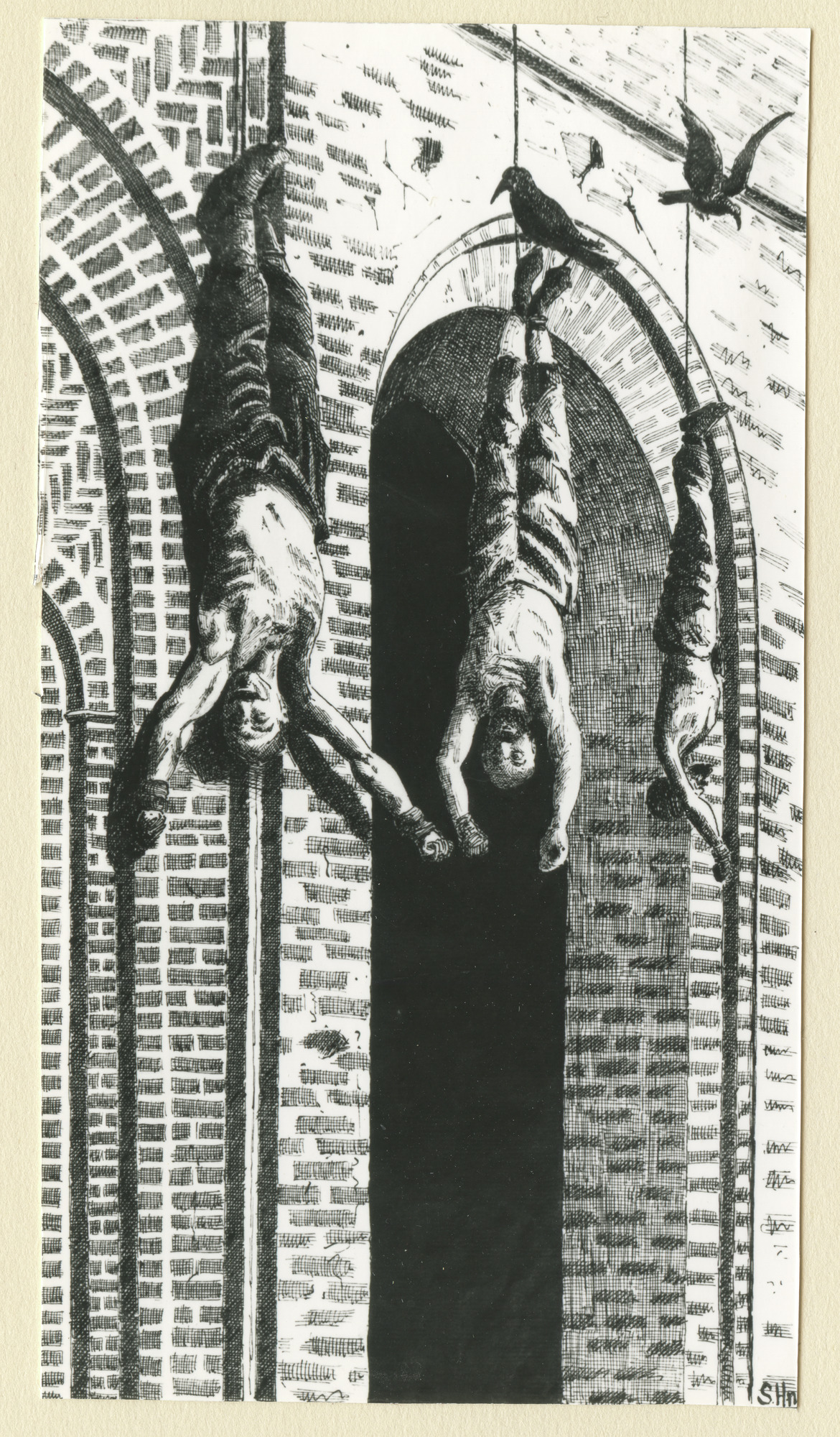 Tre män hänger upp och ner i rep utanför byggnad (moské). Svarta fåglar (korpar?) flyger runt dem eller sitter på dem. Bild finns återgiven i Sven Hedins "Genom Persien, Mesopotamien och Kaukasien: reseminnen", sida 177. På sida 175 i samma bok skriver Hedin: "Som jag redan förut nämnt , äro babis en religionssekt , som stiftades på fyrtiotalet af en lärd seid ( afkomling af profeten ) , hvilken...