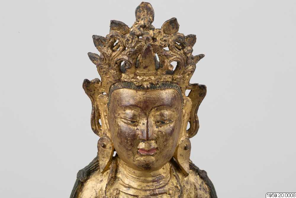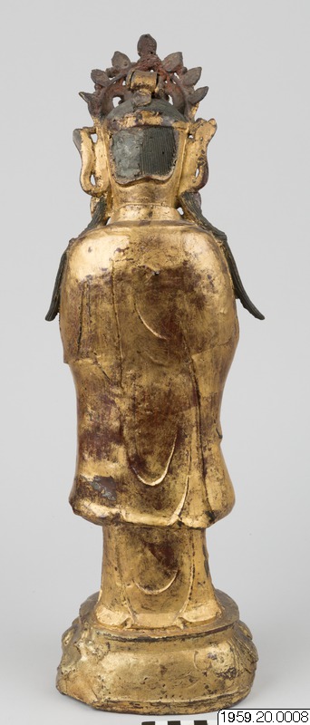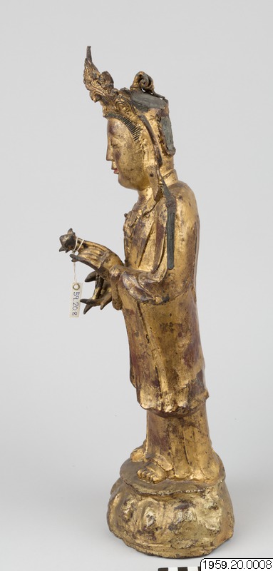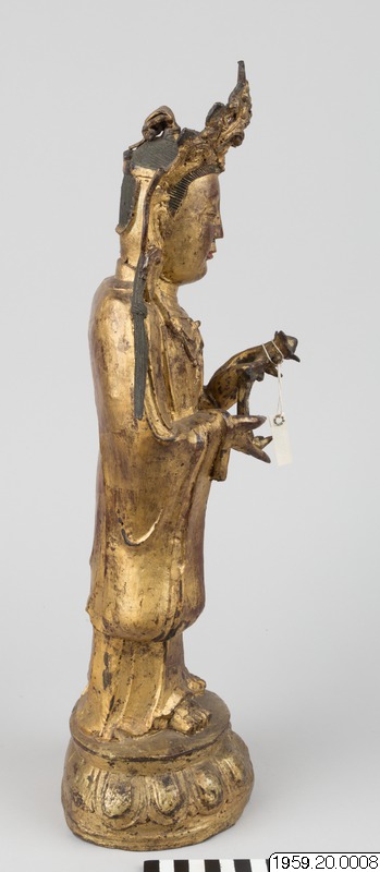 Skulptur, troligen föreställande Guanyin (fullständigt kinesiskt namn är Guanshiyin och betyder ungefär "den som hör världens ljud") med lotusstängel i händerna. Skulpturen är av brons och har förgyllts.