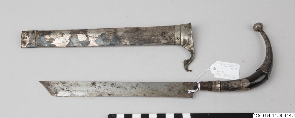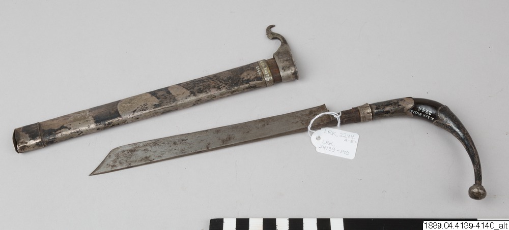 Kris med balja (nr 4140). Klinga av damaskerat stål, flamformig, närmast fästet två djupa räfflor med två hål. Fäste av trä, utskuret i form av en fågel.