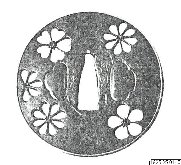 • Tsuba av järn, kantad med brons. Dekoration i negativt mönster: krysantemum, plommon och körsblom. Hålen för kusuka och kõgai fyllda, kõgaihålet halvsidigt. Signerad Aka-o, som verkade i provinsen Echizen.
