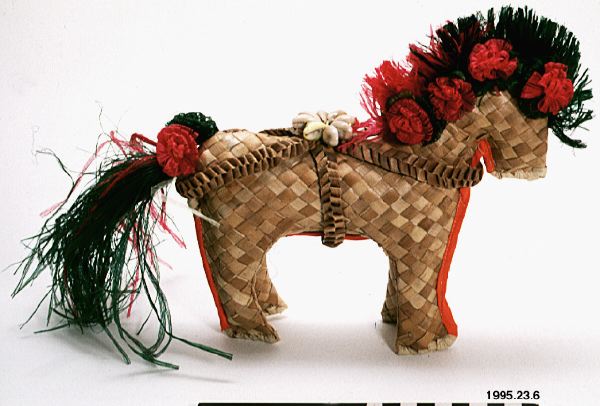 • Samlingen består av polynesiskt hantverk, tre tapa-tyger från Tonga, en pandanuskjol, en handväska samt en liten häst.