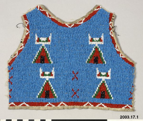 This dress item is an addition to the museum´s quite many dress items from North American Indian cultures; mainly then from the Plains, the Southwest, California and Eastern Woodlands. (SB, 2010-02-17).