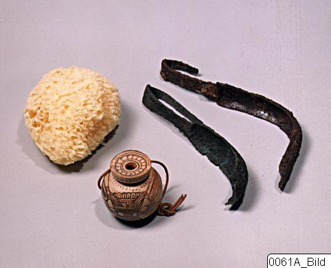 • En idrottsmans toilettsaker, svamp, strigilis och oljearyball. Grekland.