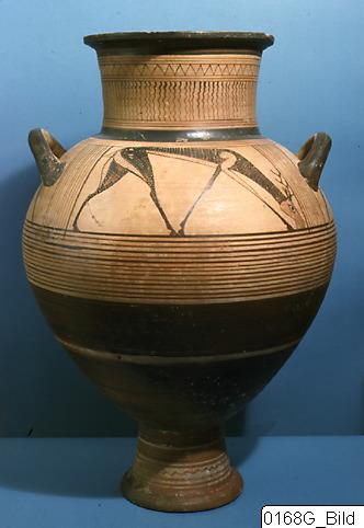 • Amfora från Kykladerna med betande hjort som motiv. 600-talet f.Kr.