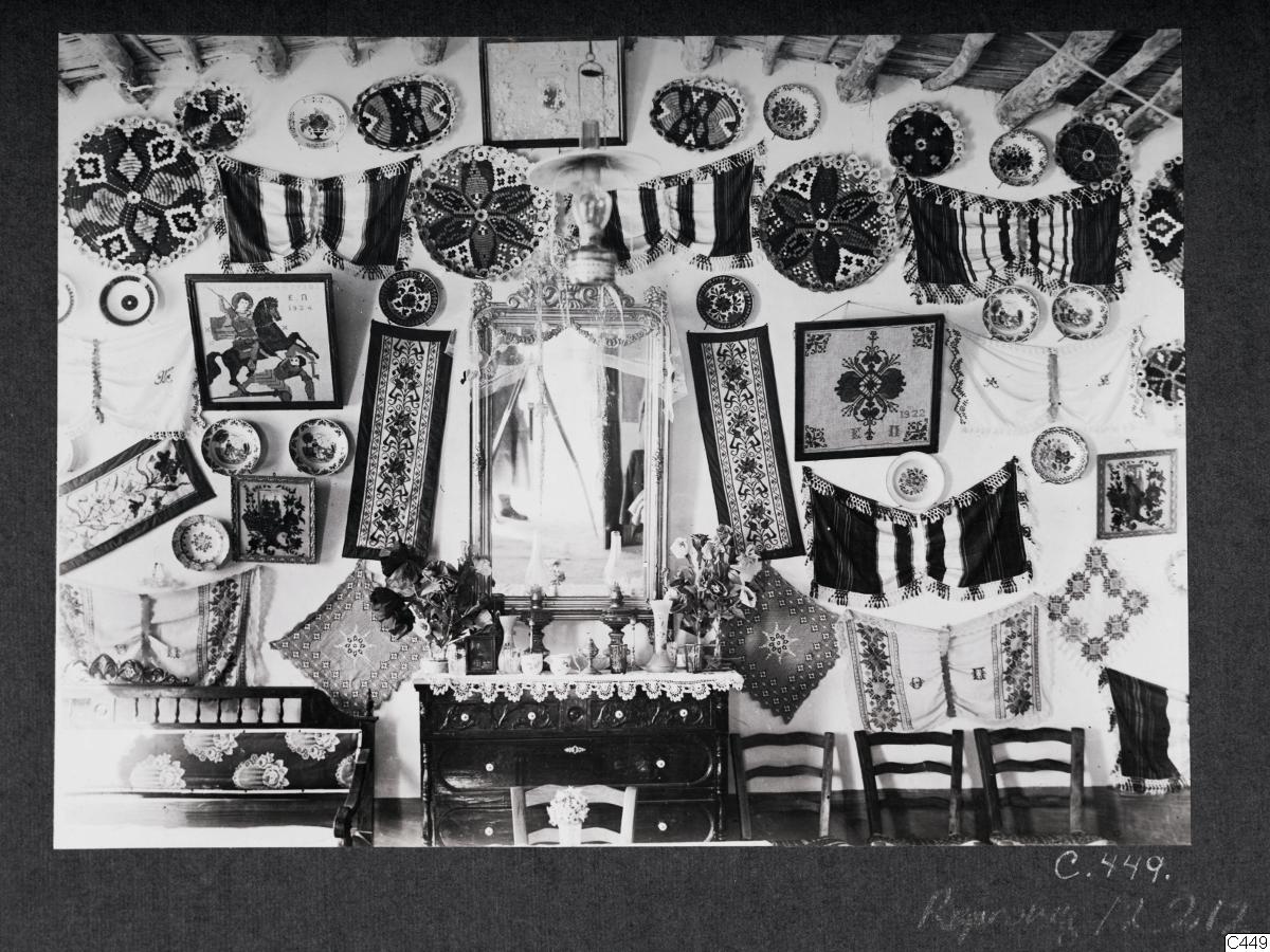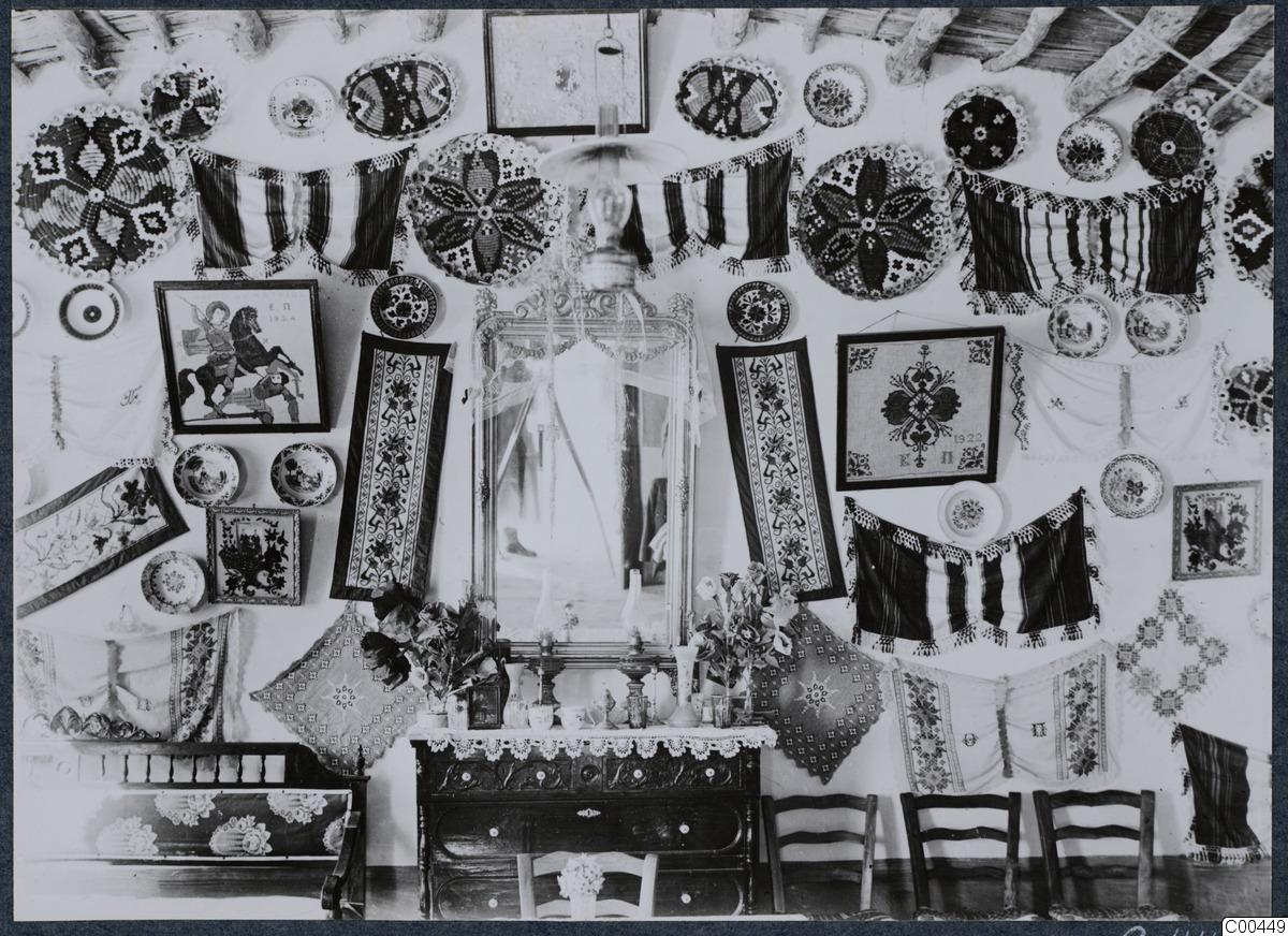 Repro. Cypernexpeditionen, Milia. Husinteriör. En vägg full av föremål såsom tyger i olika mönster, en spegel, lampa, två ljus på bordet framför spegeln. Två blombuketter. Stolar. Tallrikar och skålar.