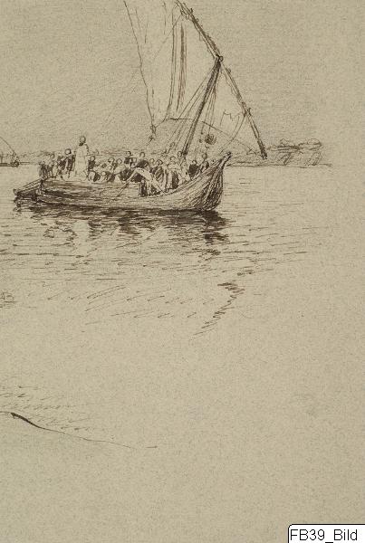 Båt på Nilen. Teckning av Ferdinand Boberg 1921. Tusch.Repro.