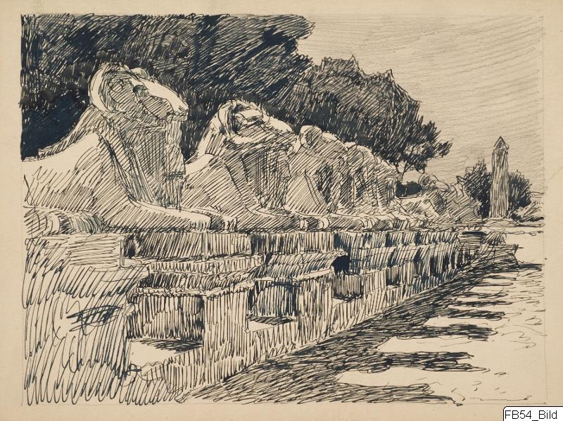Amuns tempel i Karnak, allé av vädurshuvdade sfinxer. Teckning av Ferdinand Boberg 1921. Tusch.Repro.