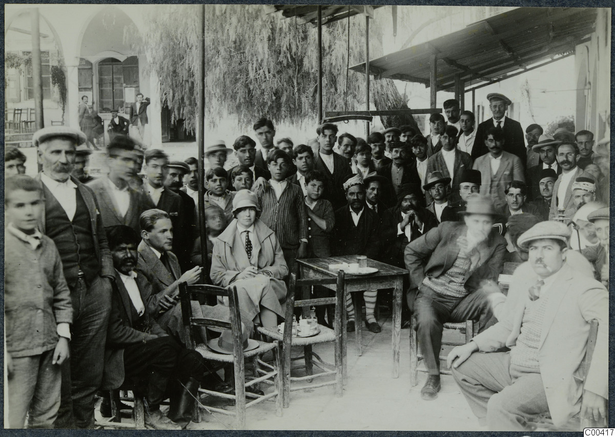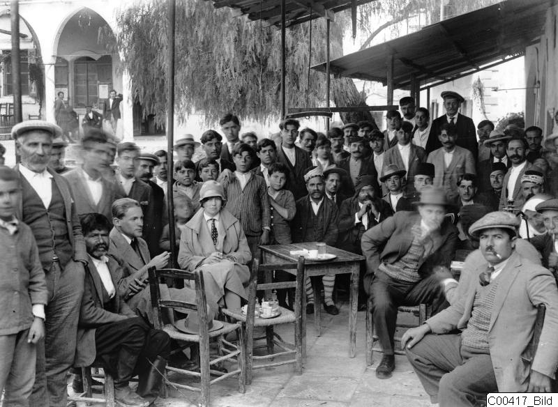 Group picture at a Kafeneion. A kafeneion is a Greek café where men gather to discuss and drink coffee. Most of the people in the picture are men. But there's one woman in the middle, perhaps this is Vivi Gjerstad with a hat. The man next to her is Alfred Westholm.