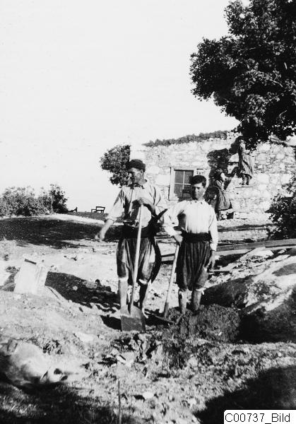 Från husbygget. Två män står i mitten av bilden och lutar sig mot två spadar. I bakgrunden syns fler personer som arbetar vid huset. Vouni. Svenska Cypernexpeditionen