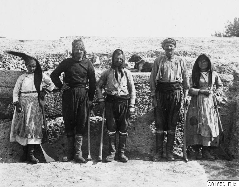 Arbetare från Tillyria, kvinnor och män. En hund vilar bakom dem. Vouni. Svenska Cypernexpeditionen