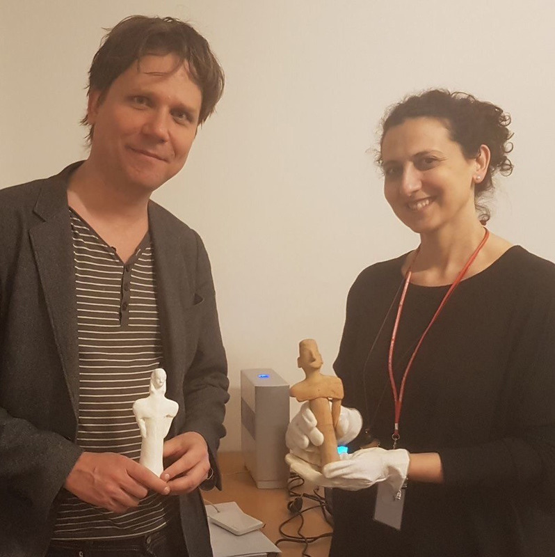 • Valentina Vassallo med en av figurinerna från Aija Irini och Johan Hägerström, VR Sverige, med en 3D-print av en annan figurin från samma fyndplats. På Medelhavsmuseet 15 juni 2017.