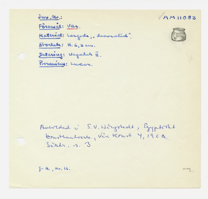 • Katalogkort ur Egyptiska avdelningens lappkatalog, D1B:3, Medelhavsmuseet. Riksantikvarieämbetet och Statens historiska museer, MM 11 000-11 499.