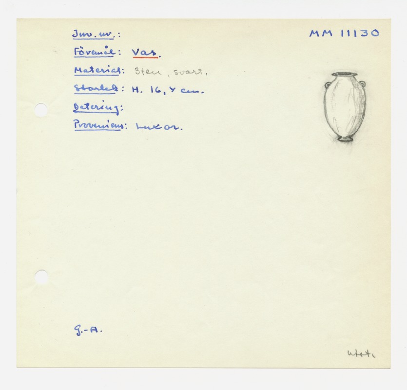 • Katalogkort ur Egyptiska avdelningens lappkatalog, D1B:3, Medelhavsmuseet. Riksantikvarieämbetet och Statens historiska museer, MM 11 000-11 499.