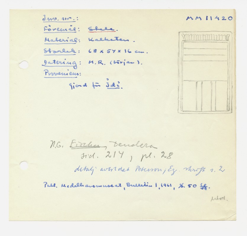 • Katalogkort ur Egyptiska avdelningens lappkatalog, D1B:3, Medelhavsmuseet. Riksantikvarieämbetet och Statens historiska museer, MM 11 000-11 499.