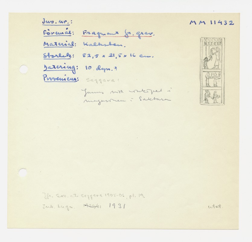 • Katalogkort ur Egyptiska avdelningens lappkatalog, D1B:3, Medelhavsmuseet. Riksantikvarieämbetet och Statens historiska museer, MM 11 000-11 499.