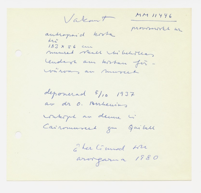 • Katalogkort ur Egyptiska avdelningens lappkatalog, D1B:3, Medelhavsmuseet. Riksantikvarieämbetet och Statens historiska museer, MM 11 000-11 499.