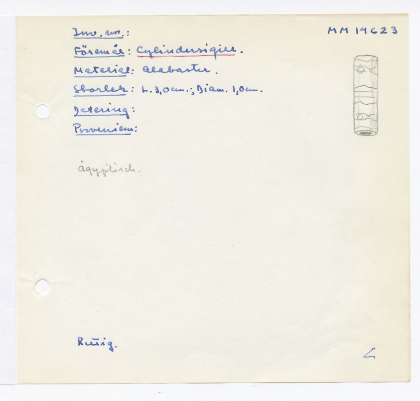 • Katalogkort ur Egyptiska avdelningens lappkatalog, D1B:6, Medelhavsmuseet. Riksantikvarieämbetet och Statens historiska museer, MM 14 500-14 999.