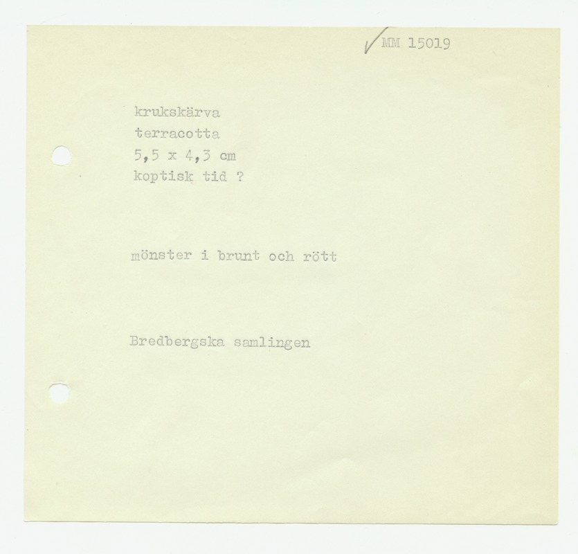 • Katalogkort ur Egyptiska avdelningens lappkatalog, D1B:7, Medelhavsmuseet. Riksantikvarieämbetet och Statens historiska museer, MM 15 000-15 499.