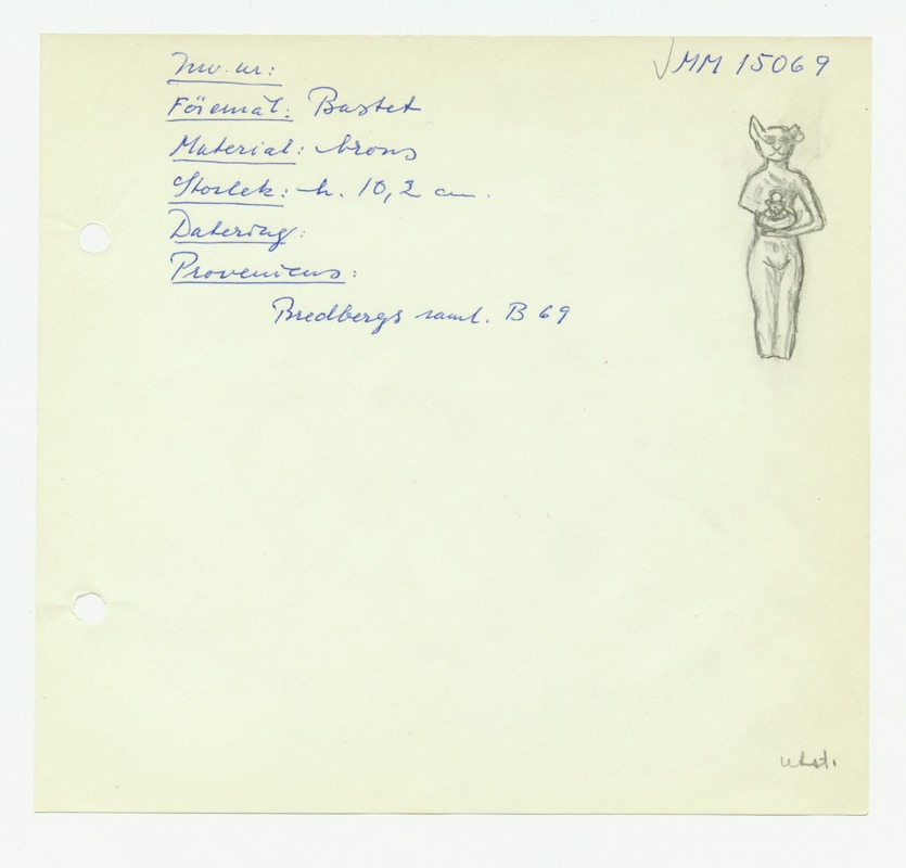 • Katalogkort ur Egyptiska avdelningens lappkatalog, D1B:7, Medelhavsmuseet. Riksantikvarieämbetet och Statens historiska museer, MM 15 000-15 499.