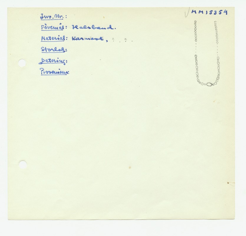 • Katalogkort ur Egyptiska avdelningens lappkatalog, D1B:7, Medelhavsmuseet. Riksantikvarieämbetet och Statens historiska museer, MM 15 000-15 499.