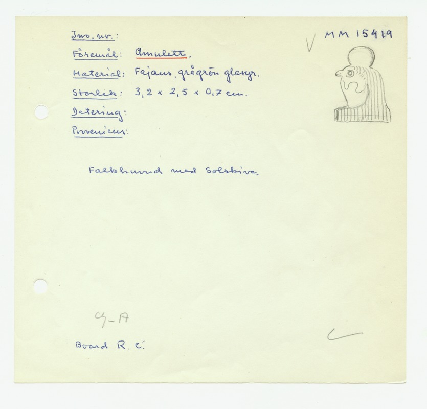 • Katalogkort ur Egyptiska avdelningens lappkatalog, D1B:7, Medelhavsmuseet. Riksantikvarieämbetet och Statens historiska museer, MM 15 000-15 499.
