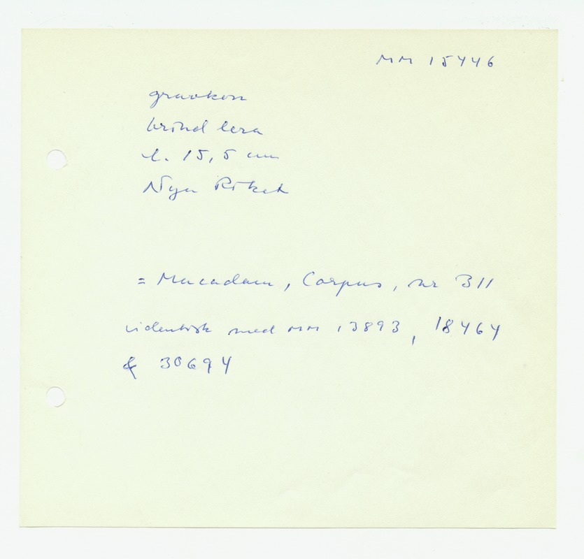 • Katalogkort ur Egyptiska avdelningens lappkatalog, D1B:7, Medelhavsmuseet. Riksantikvarieämbetet och Statens historiska museer, MM 15 000-15 499.