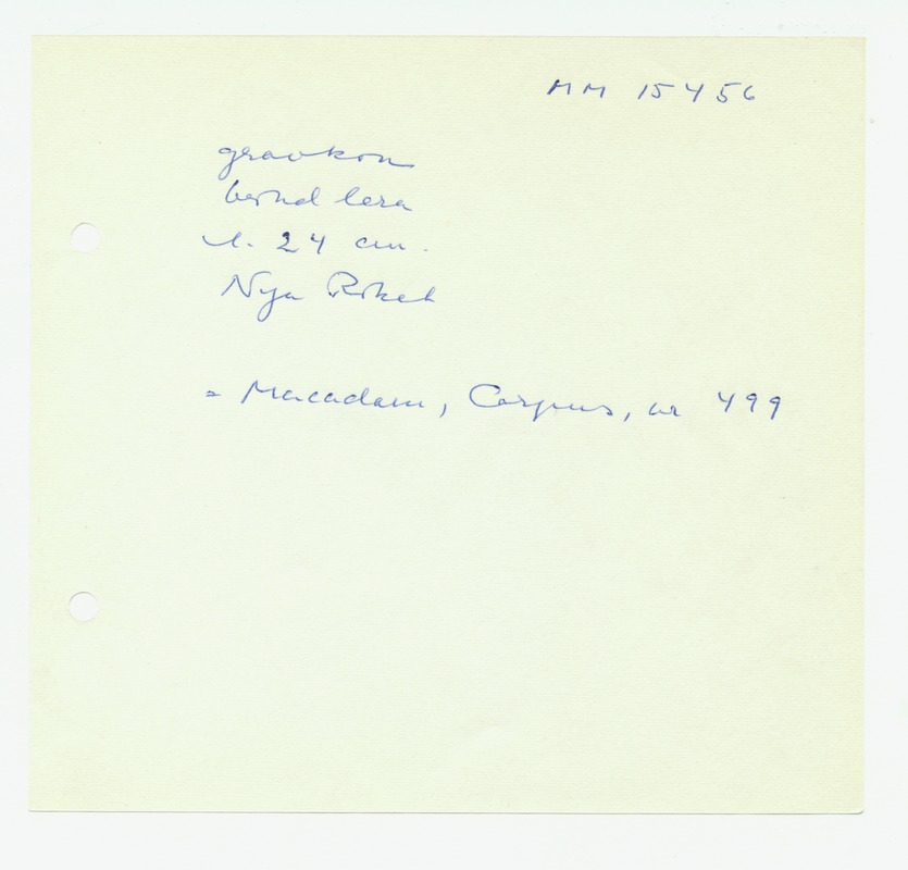 • Katalogkort ur Egyptiska avdelningens lappkatalog, D1B:7, Medelhavsmuseet. Riksantikvarieämbetet och Statens historiska museer, MM 15 000-15 499.