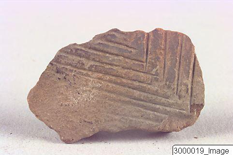 Sherd of a large bodied pot, vessel with herring bone pattern, no centre line. Well fired, reddish core. Exterior leather brown.