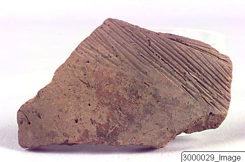 • Sherd of a large bodied pot, vessel. Herring bone pattern with centre line. Well fired, reddish core. Interior has scraping marks. Exterior dark slip, polished apart from decoration. Incision lines tightly juxtaposed.
