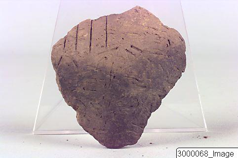 Sherd of a bulging, coarse pot, vessel. The ware is very porous, poorly fired. Interior light brown, exterior light brown with spots of soot. Exterior decorated with four juxtaposed, thin but forcefully incised lines.
