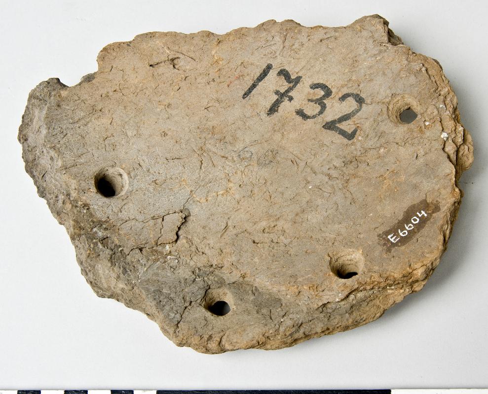 Sherd of a large bodied pot, vessel. Grey brown exterior and interior. Extremely porous, smoothed. Grey brown core. Four repair holes along fractures. The holes have been drilled from both the exterior and interior.