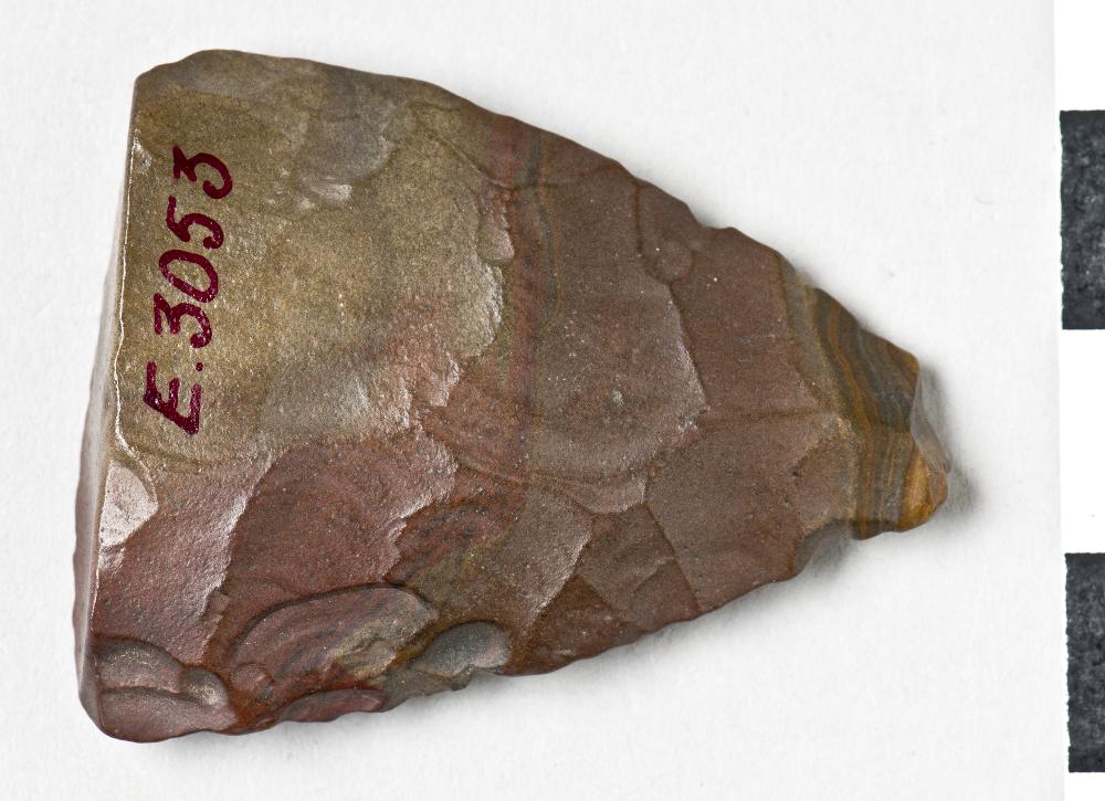 Knife, triangular, only the tip remains, worked on all sides. The edges are slightly retouched. Dark brown flint.