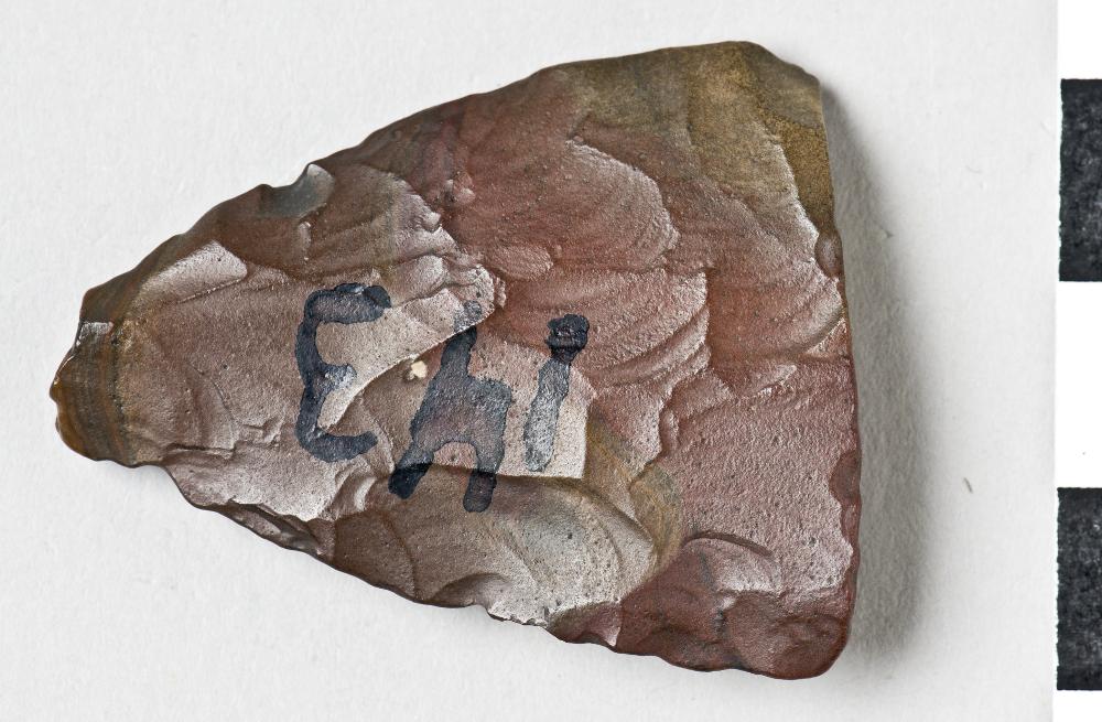 Kniv, triangulär, bara spetsen återstår, arbetad på alla sidor. Kanterna är något omarbetade. Mörkbrun flinta.