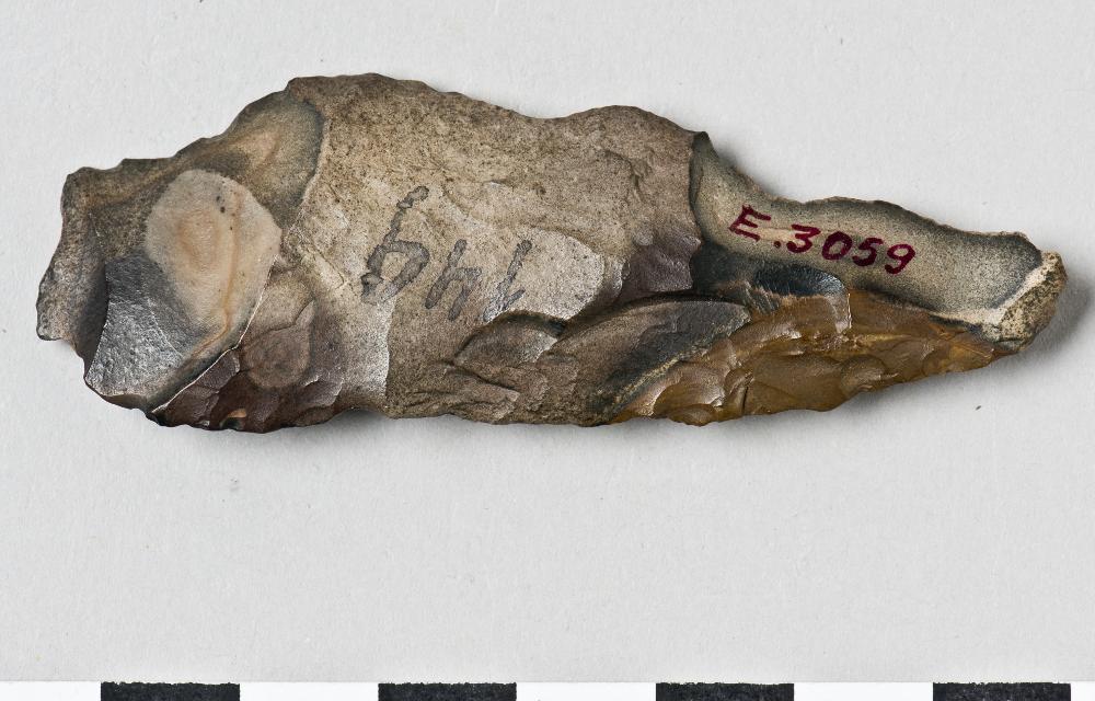 Knife, rectangular with pointed tip, worked on all sides. One slightly retouched edge, the other damaged. Dark brown flint.