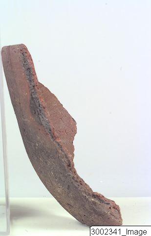 Piece of a pot, vessel, deep bowl, with a probable flat base. Covex profile. Red brown exterior and smoothed around the rim, otherwise brown with black spots, smoothed. Red interior, smoothed, partly burnished top part. Black and red core. Rounded rim.