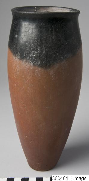 A slender beaker with a slightly convex profile, tapering, narrow to a flat base and slightly flaring rim. Black-topped with a red coated exterior. Burnished, polished rim.