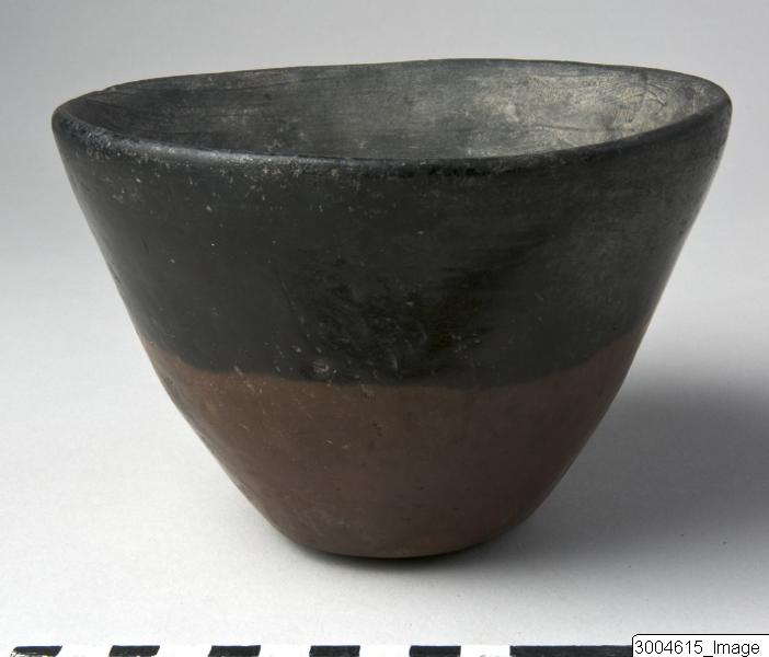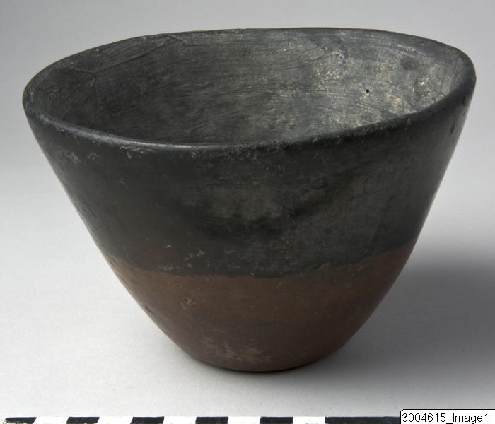 En öppen skål, vid mun, avsmalnande smal platt botten, direkt kant. Svart-toppad med en rödtäckt utsida, polerad.