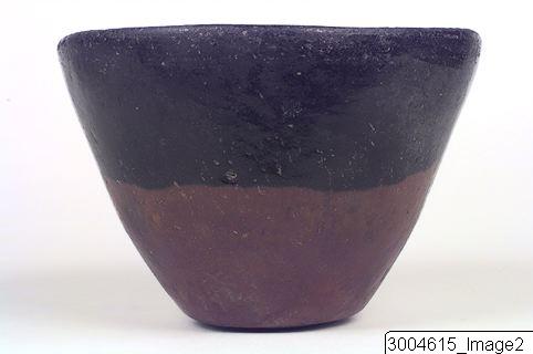 An open bowl, wide mouth, tapering narrow flat base, direct rim. Black-topped with a red coated exterior, burnished.