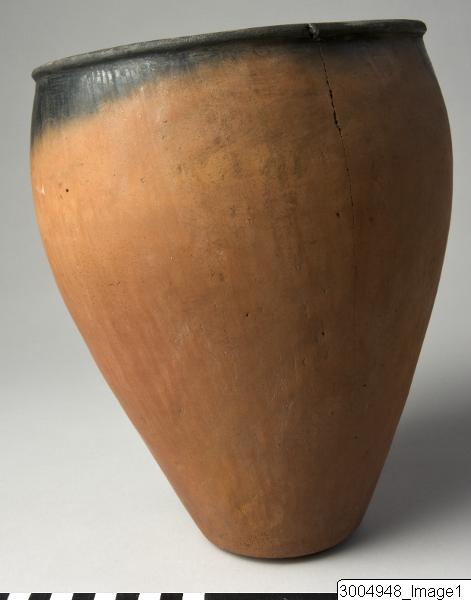 An open storage jar with a convex profile, converging at the mouth, tapering to a flat narrow base and a modelled rim. Black-topped with a red coated exterior, burnished vertically. A crack has developed.