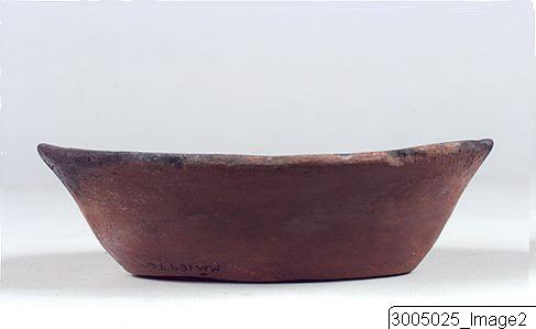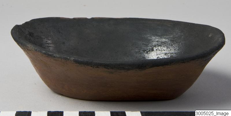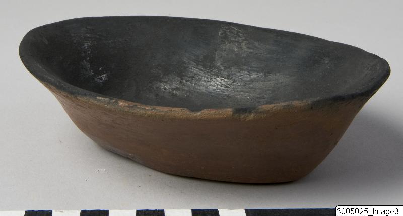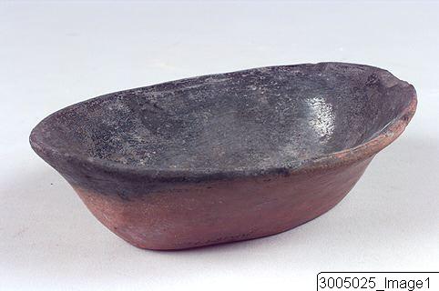 An open bowl with a flaring profile, a flat base, oval mouth and direct rim, ¨boat shaped¨. Black-topped with a red coated exterior, burnished. Black burnished interior.